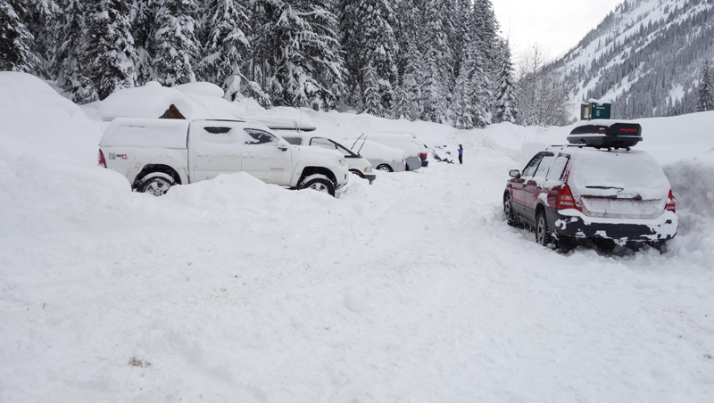 Geobackcountry. You can purchase this as an online PDF or as a mobile app. A review of this guidebook is here in two parts - part 1 and part 2. When most of the permit areas are closed you can still ski in the Asulkan or Illecillewaet drainage; a 45 minute drive from Revelstoke. Parks Canada is responsible for this lot, but their snow-clearing is haphazard (where do those Park fees go?). There are some RV's that spend a few nights here, as well cars parked overnight to access the Wheeler Hut. This can make parking challenging on snowy busy days so get there early!