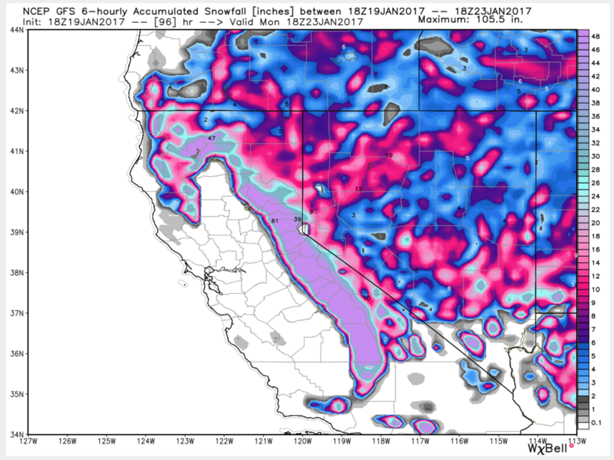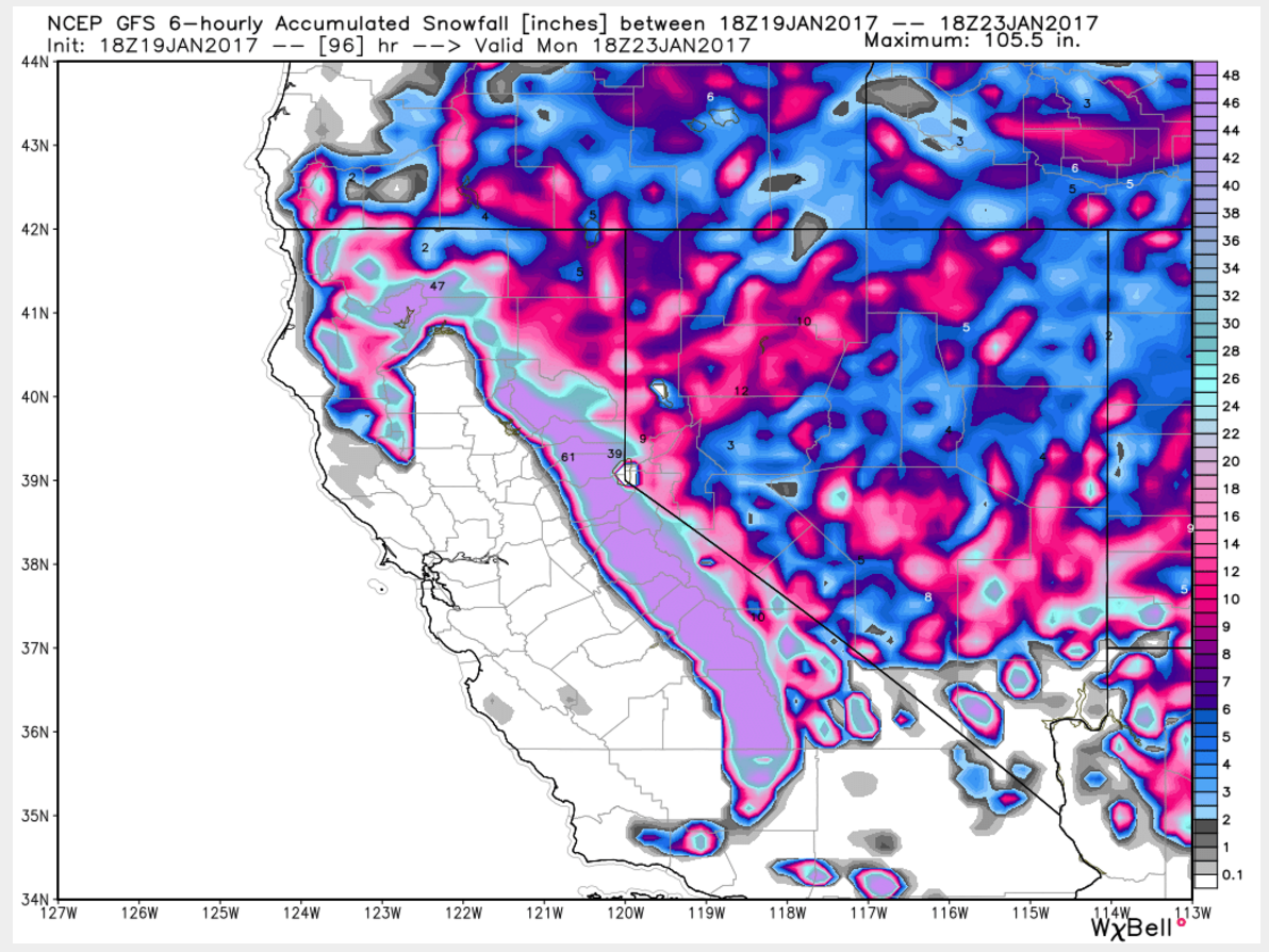 All action turns to the Sierra very early Sunday when another 2-3 feet of snow is likely. Take your picks of 1st or last chair Sunday or 1st chair Monday. “We won’t have the complete burial and shut down like two weeks ago but don’t expect your favorite chair to be open on time or perhaps not until Monday-Tuesday.”