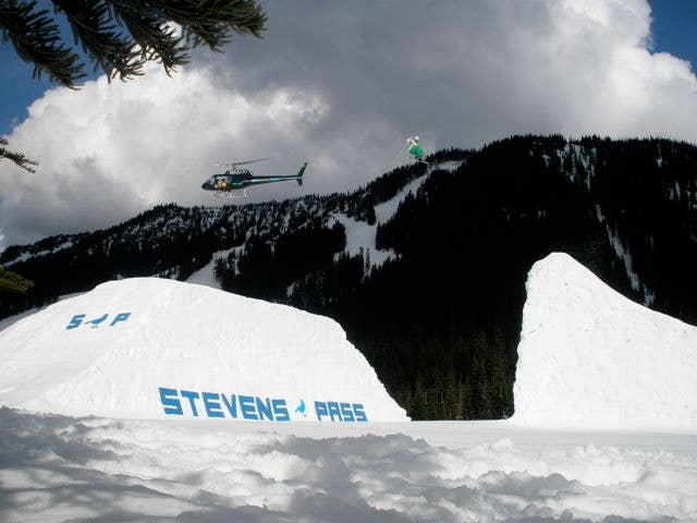 Things have been going well. We got one of our main jumps dialed in and got a solid session on it. We were able to bring in the heli and get some really good shots. Classic Washington, you never know what the weather is going to do. A typical day is a mix of sun, clouds, rain, more sun, some snow, etc. The crew at Stevens Pass has been amazing to work with. During footage review Brian Stanford, who is the Stevens Pass Park Manager, showed me some photos he took with his point and shoot. They were so sick I asked if he could email them to me, so I could put them up on the site. My camera assistant and P2 shooter Josh Brom also crushed some great stills. It is tough to get photos when you are shooting motion footage out of the bird, so these guys were key in making this happen. As always these projects are full team efforts.