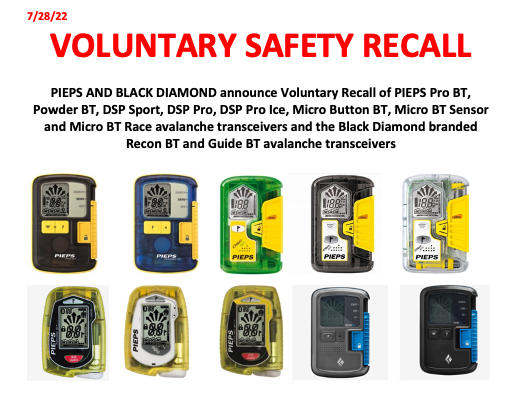 Black Diamond Equipment is issuing a voluntary safety recall on some of its avalanche safety products, including the PIEPS Pro BT, Powder BTW, DSP Sport, DSP Pro, DSP Pro Ice, Micro Button BT, Micro BTW Sensor, Micro BTW, and Black Diamond Recon BT and Guide BT avalanche transceivers. This follows a safety check notice issued in April 2022. The issue is related to a material manufacturing problem that causes the beacons to not switch from SEND to SEARCH modes, rendering the units unable to function in an avalanche rescue scenario. It affects a small number of units. Black Diamond will replace or repair all affected transceivers that do not pass the safety check free of charge.