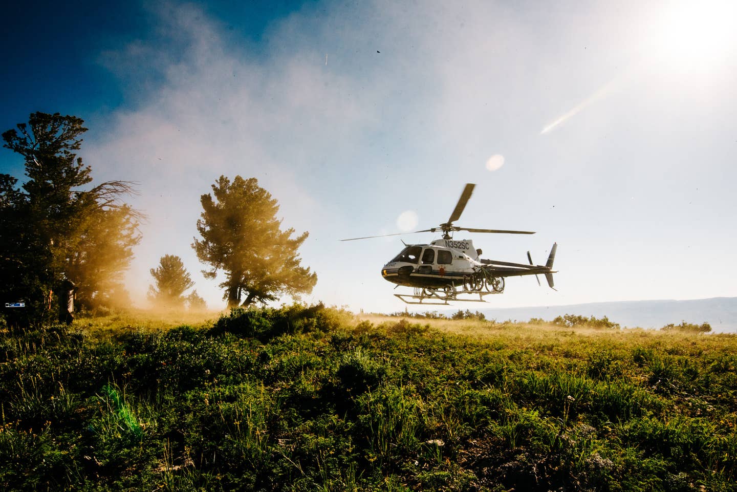 After arriving at Whisper Ridge headquarters in Eden, Utah for a quick morning safety briefing over delicious breakfast burritos, we made our way to the heli base. Joining us for the day were pro freerider Eric Porter and pro EWS racer Cody Kelley, both stoked out of their minds to spend a day not pedaling. Located a short drive up a dirt road from HQ, the base of summer operations centers around a canvas-tent camp set up with a stunning view of the mountain we were about to spend the day shredding down.