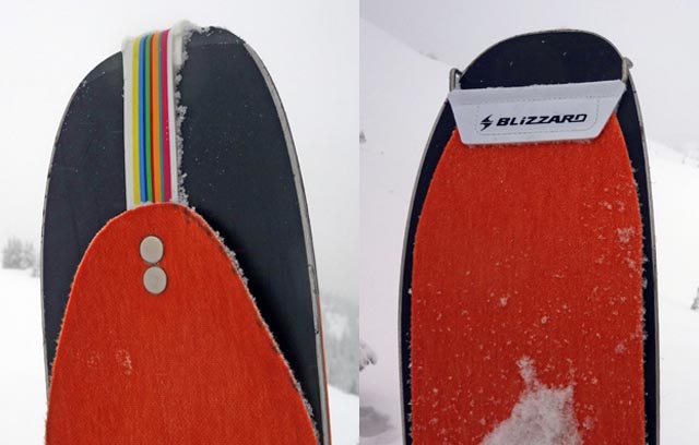 Included with the ZeroG skis are ZeroG skins. These are cut to fit to the ZeroG 108 and are made for Blizzard by Pomoca from a mohair/synthetic plush. They have a stitched wire tip and adjustable tail strap which conveniently doesn't slip off the notched ZeroG tail. The skins glide exceptionally well and pack nicely because they're so light. The glue is on the light side and I found that touching up the tail with some additional skin glue was necessary on those yo-yo days with many transitions (the webbing on the tail.lifts the skin off the ski base). Because the skins are so light they're a tad fragile so be warned if you have the bad habit of skinning over rocks.