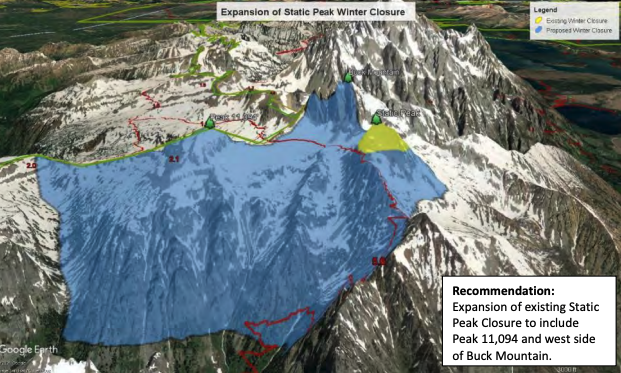 Currently, GTNP already enforces seasonal closures on parts of Mount Hunt, Prospectors Peak and Static Peak as part of a bighorn sheep protection plan. These closures have existed since the late 1990s and were based on the idea that winter recreation was causing harm to the sheep. Biologist