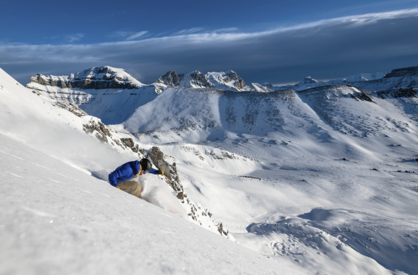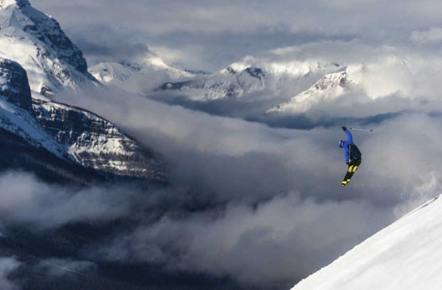 If this were Instagram, the scene before me might seem cliché. My ski tips dangle over a cornice while a steep, blue spine screams back up in the key of ecstatic tension. ER3 is one of Lake Louise Ski Resort’s marquee big-mountain lines in what feels like an endless amphitheater of cascading geology. The Canadian Rockies are some of the youngest mountains on the planet, and the Earth’s strata are on display like it’s been dissected. If I turn 180 degrees though, hundreds of placid ice-skaters look like ants on the frozen lake this mountain is named for—basking in quintessential Canadiana framed by frosted Christmas trees some 3,000 feet below. Meanwhile, I’m engaged in serious business.