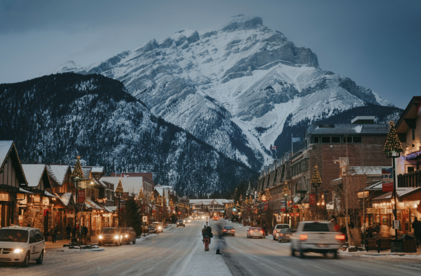 Banff Avenue with a view of Cascade Mountain. Photo courtesy of SkiBig3.