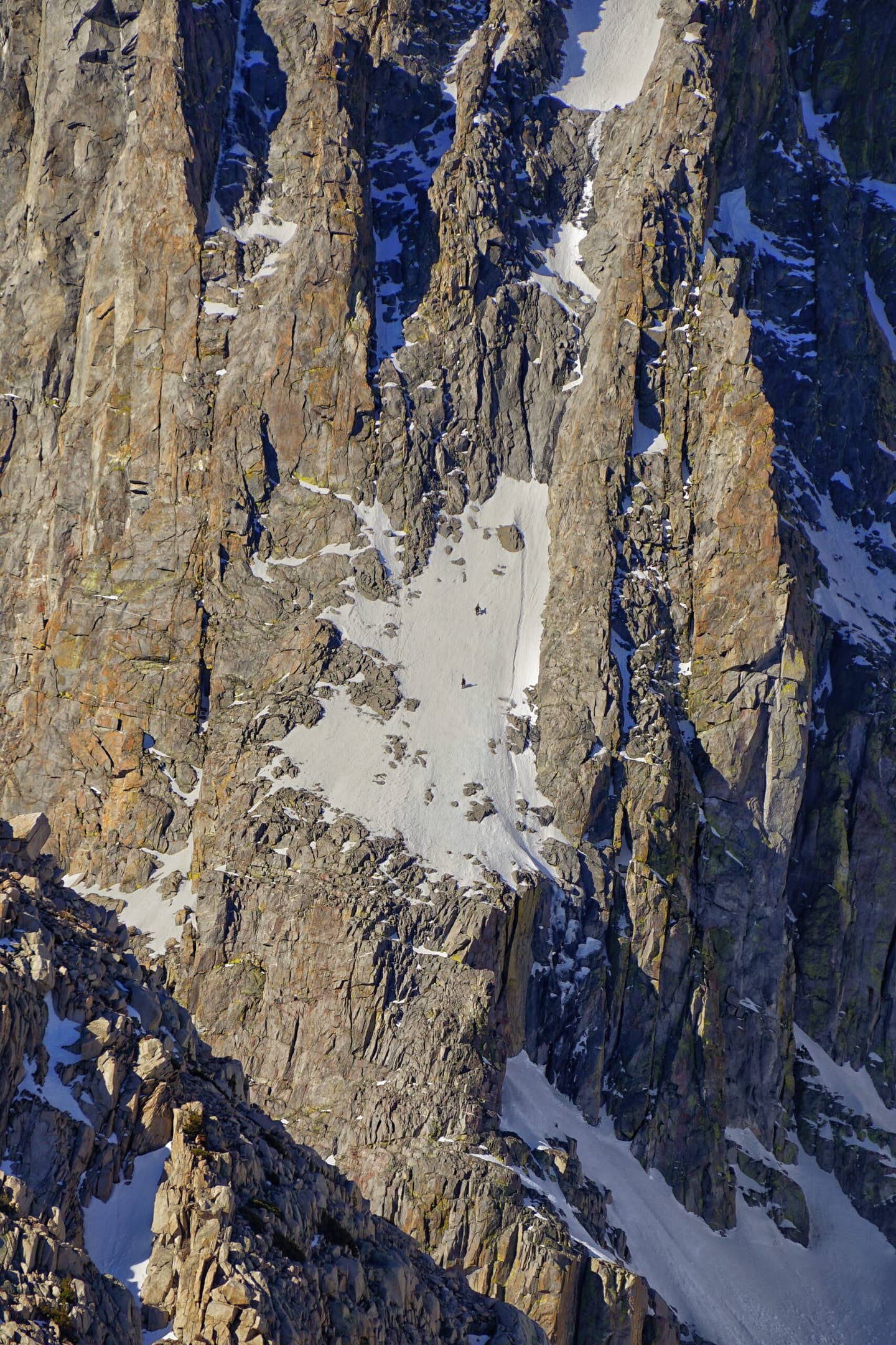 We made it to the top around noon with the shadows just starting to creep over the couloir. We didn’t know what to expect for the climbing but we guessed there would be easy 5.7ish with some 5.9 moves and that is kind of what we ran into. There were a lot of options and looking back I am happy with the way we went up. we brought a lot of gear with us and Colter brought some old gear to leave as anchors for the way down (there were a few anchors in place from previous climbers) but we did set one ourselves.