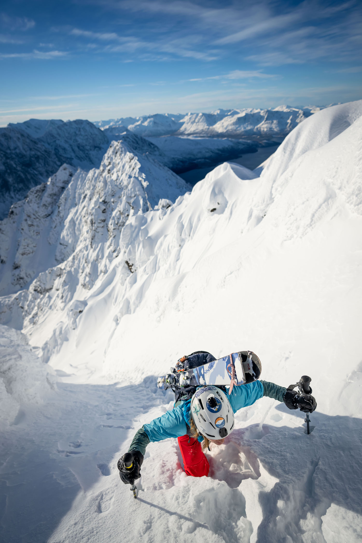 At TSG, Johnston has quickly become a go-to guide for filmers, professional skiers, commercial clients looking for a good day in the fjord-riddled mountains, and certainly by women searching for strong role models and mentors in the outdoors, a position she wholly embraces. She’s fully sponsored herself, working with brands including Norrøna, SGN skis, Vertical Playground (G3), and Petzl, and often puts on women’s camps ranging from avalanche skills and safety to how to pick and send big, fun, freeride lines.