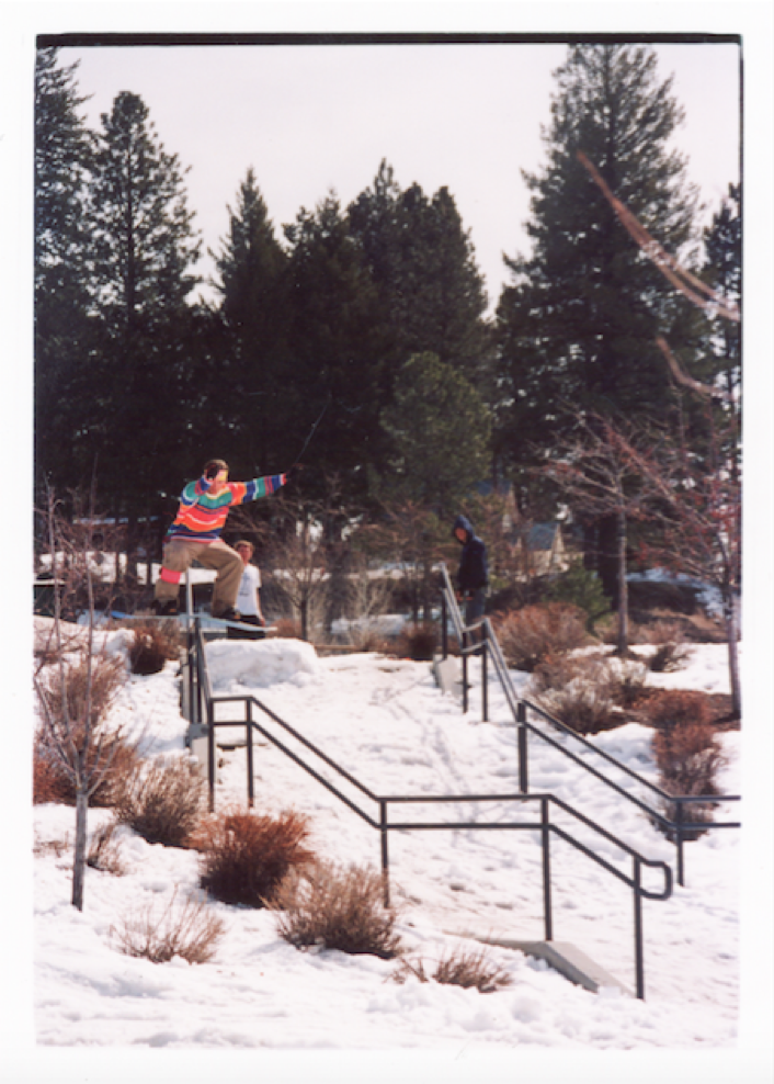 “I liked to document riding that was relatable. Travis and Jussi could do 900s into powder, but I was more excited to shoot them playing around on groomers, riding the public snowboard park, or jibbing a trash can lid in the backyard.”