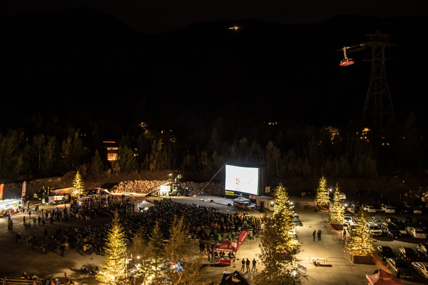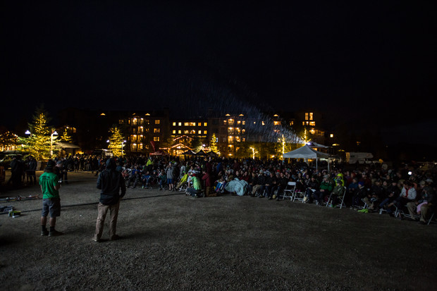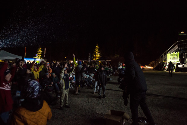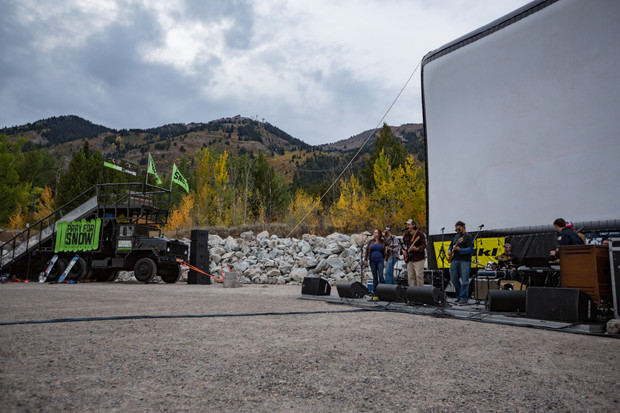 The world premiere this year was set up in the shadow of the resort that we have called home since day one – the 3 story tall screen looked tiny compared to Jackson Hole in the background, and the Tangerine Dream parked in front of it even smaller. With the Deadlocks playing on stage and the 10 Barrel Pray for Snow rail jam going on, the energy was firing before it was even dark enough to turn on the projector. A full crew of athletes were on hand to sign posters for our fans, and not even a little rain could put a damper on the evening (thankfully the Dream doubled as a stage for DJ ManCat to rock the house).