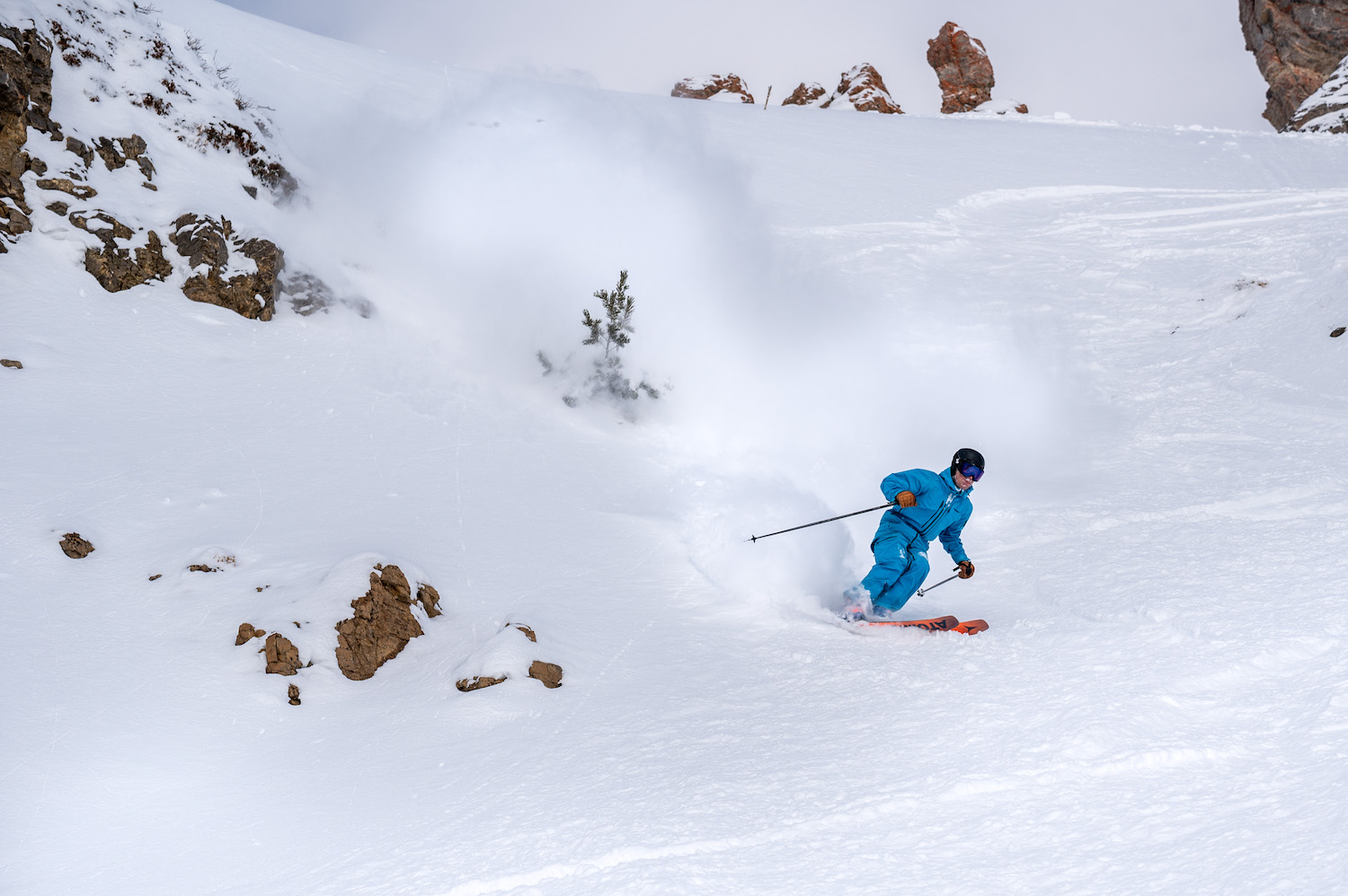 Of course, I took these skis out for a few laps in the JHMR sidecountry to hunt for some bottomless untracked powder and find some more technical big-mountain terrain to ride. Unsurprisingly, opening it up on classic runs on Cody Peak or navigating steep tree alleys on 4 Pines was a blast, and showcased the ski’s incredible balance of stability and responsiveness. While it likes to monster truck through terrain, quick pivot turns and sudden direction changes feel really easy in deep three-dimensional snow.