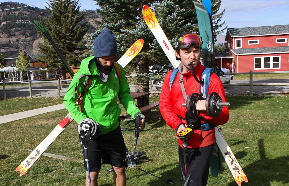Actually, you don’t get off that easily. Add ankle and wrist weights. Now that you look totally ridiculous, you’re in for one of the most miserable, and best bang for your buck (and time) workout methods, and one that translates directly to skiing muscles, downhill power, and cliff stomping strength. You can do a lot of beneficial workouts in this get-up, but walking slowly, carefully, and miserably downhill is an A-game clincher.