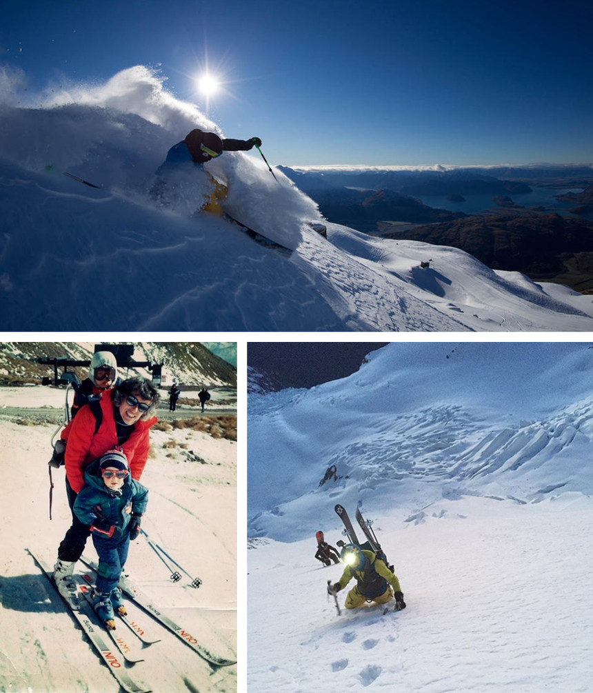 Top : Sam Skiing Treble Cone Left : Sam Learning to Ski Right : Hiking The East Face of Mt. Cook in NZ with Xavier de la Rue