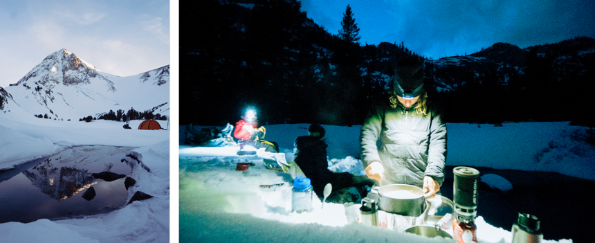 Part of camping is an epic campfire, right? Well, not when winter camping in the mountains. However, the team needed to fuel up, and delicious dinners were cooked thanks to the MSR Whisperlite stove. The powerful and efficient liquid fuel stove has been a go-to for mountaineers and backcountry travelers thanks to its ease of us and easy field maintenance. After eating some hearty meals, the crew would hang out watching the sunset fall across the peaks with a hot cup of tea in hand, held warm thanks to their Yeti Mugs.
