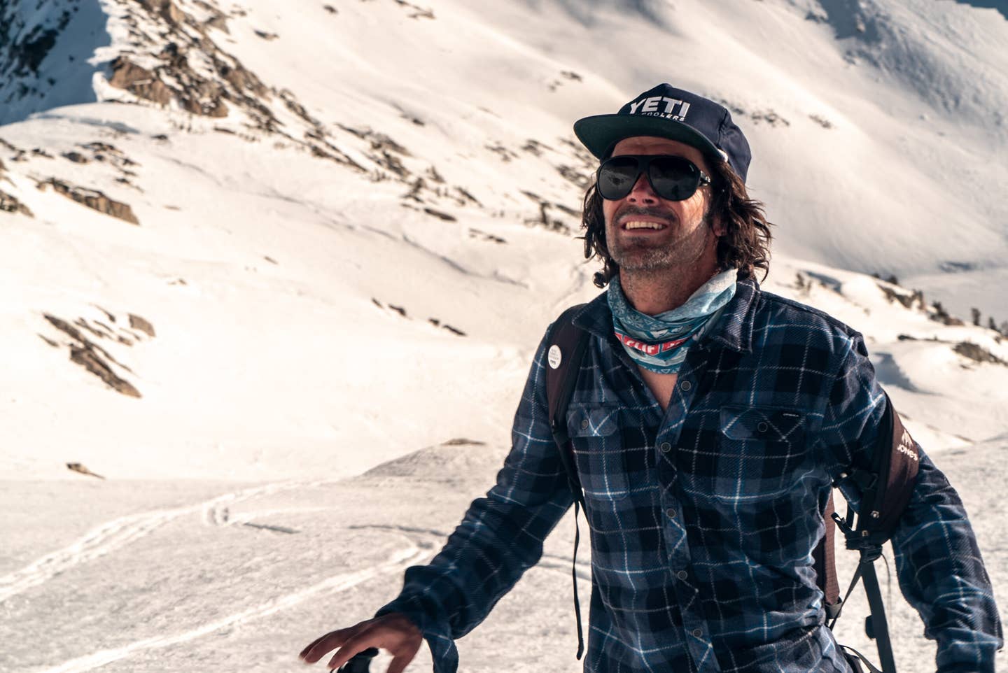 Eye protection is crucial in the harsh light of springtime mountains, and Jeremy Jones turns to a trusted hat and sunglass combo.