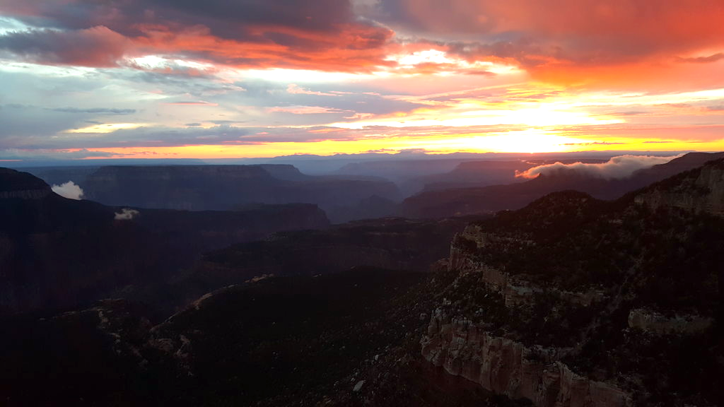 A little after 4:00 PM and I finally got myself to the North Rim entrance. No entry fee that day due to the 100th anniversary of the National Park Service, normally that'd be exciting but I already paid for a National Parks Pass. I asked for directions to get to Locust Point. I knew it was around 20 miles into the forest; I just needed to know the specifics. I could tell that the ranger manning the entrance booth was new when he was flipping the map up and down to figure out which way was which. After he looked it over, pointed out the roads I needed, and made a few marks for me, I thanked him for his help and went to do some sight seeing before I went looking for a campsite. About twelve miles past the entrance is the North Rim visitors’ center where you can walk to overlooks for the canyon. Immense. That is the only way to describe it. Lo and behold, I spot another storm rolling in from the distance. I snapped my pictures and got out of there before I got stuck in another one of those. Hail in the desert? What kind of shit was that? I was running out of daylight to dry me off and it was much cooler at this elevation than the desert riding earlier in the day so I wanted to avoid more rain. The ranger at the entrance to the park had told me the road I was looking for, route 22, was five miles inside the park. So I backtracked from the visitors’ center to look for the road. Nothing. There were roads, some without signs, some with signs, but none with signs reading 22. I did a few sweeps through to make sure I wasn't being a blind fool. Nothing. I made my way back to the visitors’ center so I could get some better instructions. "Ohhh, yeah route 22 is about five miles back from here." I must be exhausted, I thought, because I didn't see a single sign with anything resembling a 22 while riding around. So I rode back another five miles and took a road that I was almost sure was wrong, but figured it couldn't possibly be any other road. I was getting increasingly frustrated because my daylight was rapidly diminishing, the temperatures were dropping, and the storm was right on top of me. I turned around, with the rain starting to sprinkle, and found the first ranger I could. Third time is a charm. She informed me that the road I've been wasting all my daylight looking for is several miles OUTSIDE of the park in the Kaibab National Forest. I thanked her profusely, sat on my now wet bike, and rode back on the now wet roads. I was pretty damn frustrated at this point. Seeing this, the universe decided it needed to really fuck me up good. That's when the hail started. Riding through rain feels like being stabbed with needles, but riding through hail feels like being stabbed with knives. I had to pull over and wait for the hail to stop before I could continue. The hail eased up within minutes, the rain went back to a light sprinkle, then stopped completely. The sun wasn't much use for heat and warmth at this point so I rode out of the park soaking wet and freezing. Noticing I had less than 80 miles of gas left in the tank, I figured I better fuel up before I head into a forest for the night. Getting gas was the one smart decision I made this day. Finally, finally, finally I started riding the 24 miles of forest road I needed to get to Locust Point. But it wasn't just one road that I needed to get there. There was a network of roads, all of which lead to different points along the canyon. To my surprise, the road was well maintained and easily manageable on my Shadow. I got a few miles in, found the next road I needed and continued on. I might just make it with a little light to spare, I thought. Oh how wrong I was. With visibility getting worse and worse, I missed the sign for my next turn and continue riding straight until I got to a puddle that covered the entirety of the road. No way around it. I checked my map, and realized I needed to turn a while back. I was annoyed but also relieved I didn't have to cross through the mess in front of me. All the time I wasted throughout the day had finally caught up to me. It was dark now. With each turn, the road conditions got worse and worse. The rain from earlier left puddles scattered throughout the road but easily avoidable. Mud was flung all over but I didn't care. I got into a comfortable rhythm cruising the forest roads and dodging puddles in the dark. I should have figured I wouldn't have gotten to the end without a few mishaps. Riding my cruiser a bit quicker than I should, on gravel forest roads after a rain, in the dark, you can imagine the issues I'm about to have. Sneaking up on me, I rode directly into a puddle covering the width of the road. The rear tire washed out to the left and the bike went down to the right. Between my anger and the adrenaline rush of dumping my bike in mud, I was able to lift it up without much issue. So now my bike and myself are covered in mud. And wet. And cold. In the dark. Miles deep into the forest. There's no going back now. A few more miles, a few missed turns, a few times stopping and using my headlight to read my map, and I get to the last road I need. "Locust Point 8 miles.” I was so relieved. I crawled my way along, learning my lesson from earlier. Another road-wide puddle was coming up but I saw a small chance of an easy crossing, an elevated dry spot on the right side of the puddle. If I hit it just right it would be smooth sailing. Well I didn't hit it just right. The rear tire started fishtailing to the left. I got a foot down for some support but in the process I grabbed a hand full of throttle. The tire caught traction somehow, standing me directly upright. Except now I wasn't facing forward towards the road. I was 90 degrees to the right and accelerating into the trees. I managed to grab my front brake and stop right in-between two trees. The whole thing happened in less than a second. 500 hundred pounds of metal sinks down pretty quick onto a soft forest floor so it took a bit of rocking to
