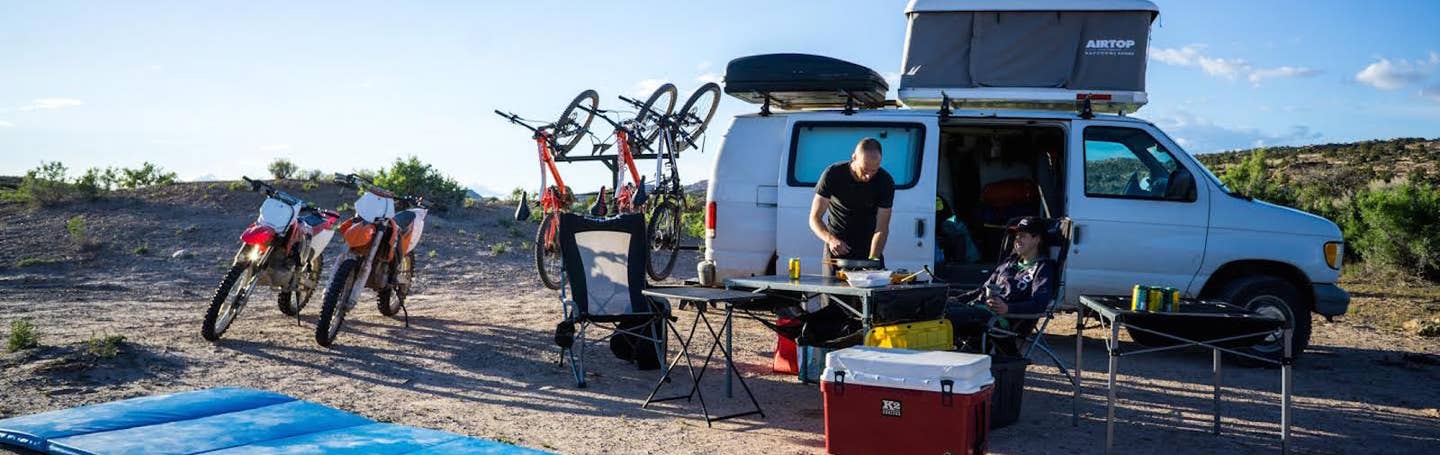 We hoisted a car top tent (Autohome, $2900) on top of Great White, attached a custom hinging bike rack to the hitch ($600 and our own design), filled the back with dirt bikes and other toys, and moved our life onto the road.