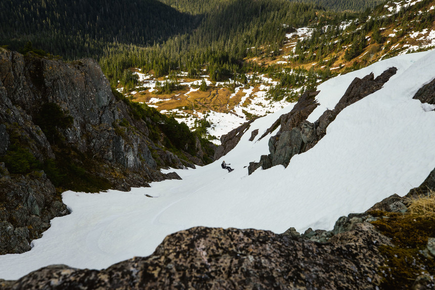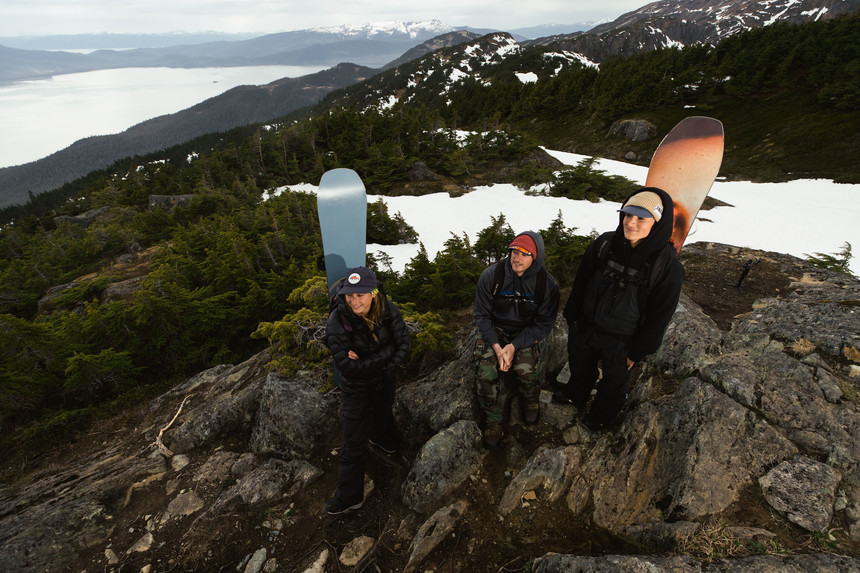 Rejuvenated from the warm waters, the crew set their sights on the main objective for Juneau: snowboarding. Even though the area was transitioning into spring, there was still plenty of riding if you were willing to work for it. Thankfully they had a little extra help from friend and fellow snowboarder Mark Rainery, who calls Juneau home. With his valuable intel, they were able to hike a few lines at Eaglecrest ski area. And while it was no walk in the park, they at least got to enjoy stunning views of Juneau whenever they needed a breather. Not bad for type II fun.