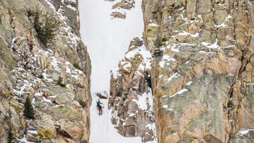 Luckily, the production team didn't need to follow Tim and Colter up the couloir. Eric Parker photo.
