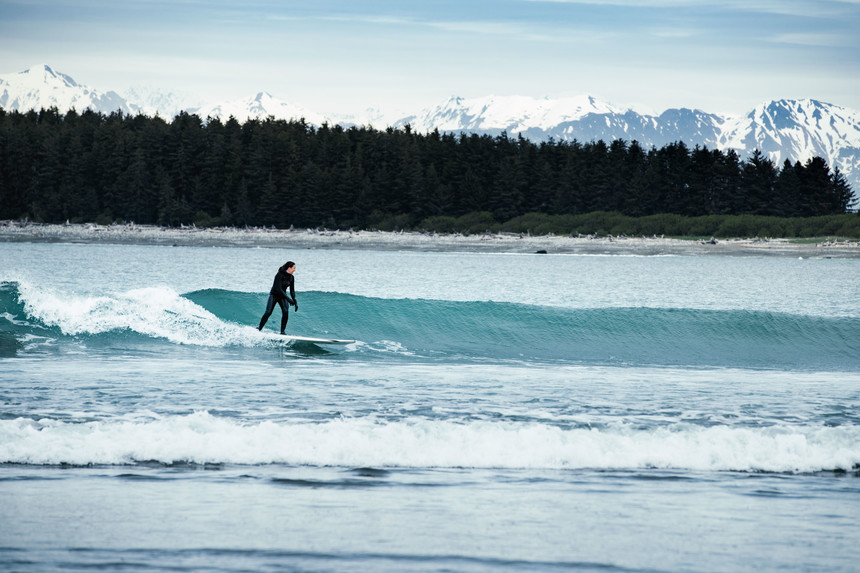 Equally, as passionate about surfing as she is snowboarding, Rand loved her time up in Yakutat, Alaska. Justin Mayers Photo.
