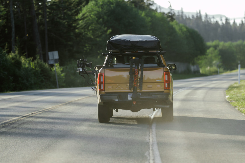 While Team 2's production team had many of these gadgets at their disposal, they often opted to go barebones. It might sound crazy, but it was with good reason. To create a more visceral experience, the team shot many of the film's scenes handheld. It's a simple technique that goes a long way. All in all, it's a more immersive filming style, not as commonly used within action sports because it's not always as clean looking. For Director of Photography Jacob Callaghan, that meant running down the trail, RED camera in hand, as Hana and Mary zipped ahead on their mountain bikes. When they were in Juneau, Callaghan ditched the fancy gimbal and just skied next to the gals in order to convey the actual feeling of sliding down the mountain. When it comes to this unconventional film style, it's all about balance. If you're quick to get motion sickness don't worry, it's not used for every shot. For things that required a smoother shot like driving, the camera was rigged up on the side of the Ford Ranger to seamlessly film as they drove.