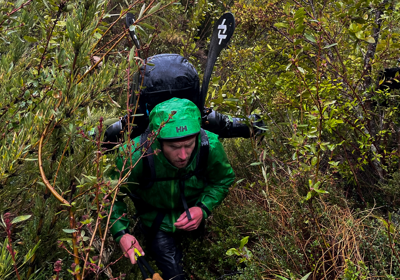 Now we were hacking our way through the Patagonian rainforest on foot. Lacking a trail, we used GPS and wild boar trails to make our way towards the ridgeline we hoped would provide access to the upper snowfields of the mountain.