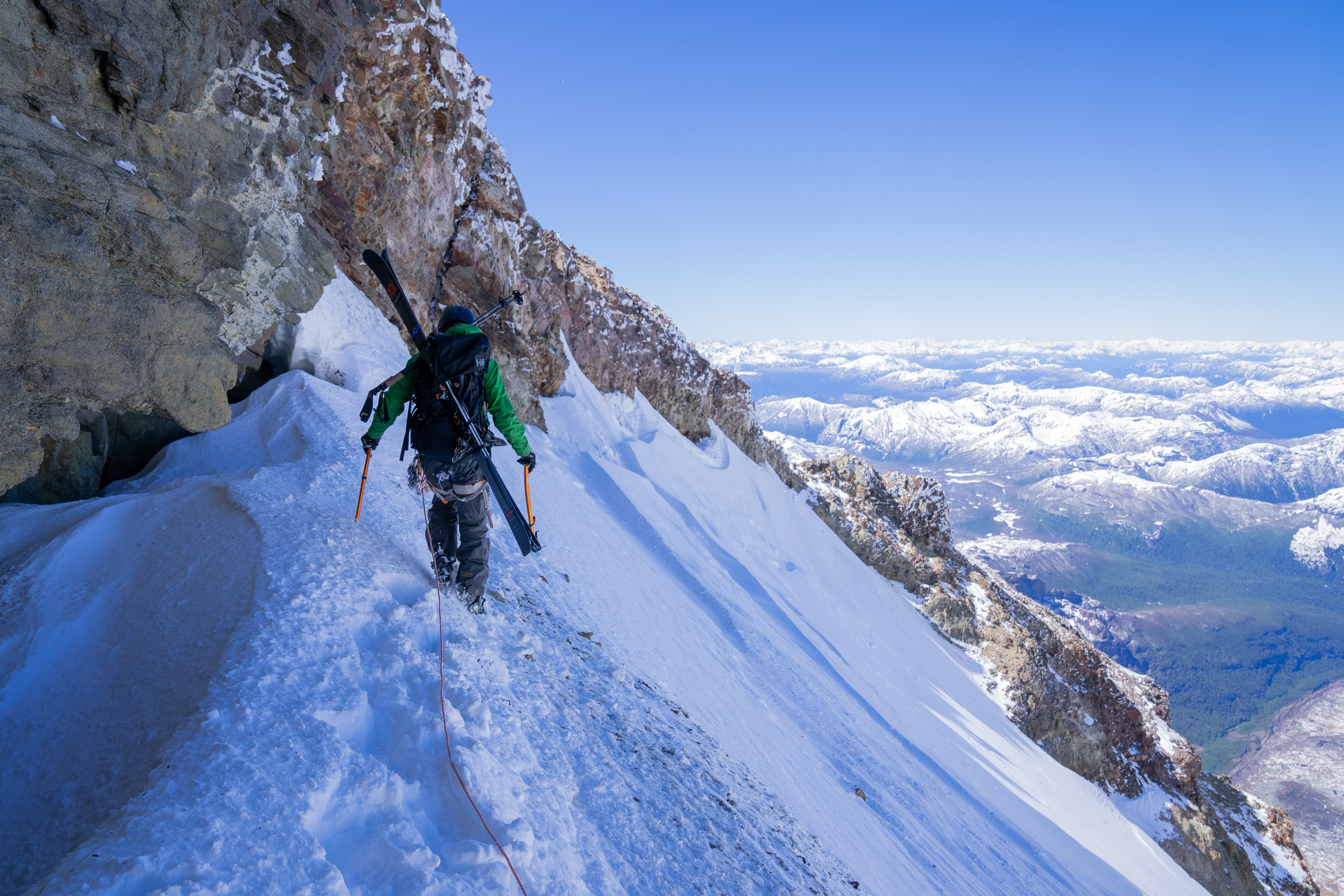 Roped together, we set off in the direction of the peaks. We skinned in between gaping crevasses until we reached the basin below the west face of the Pico Argentina, one of Tronador's three peaks. Too close to the top to turn around, we transitioned to crampons and climbed to the highest skiable point. A short vertical band of rock above us marked the summit.
