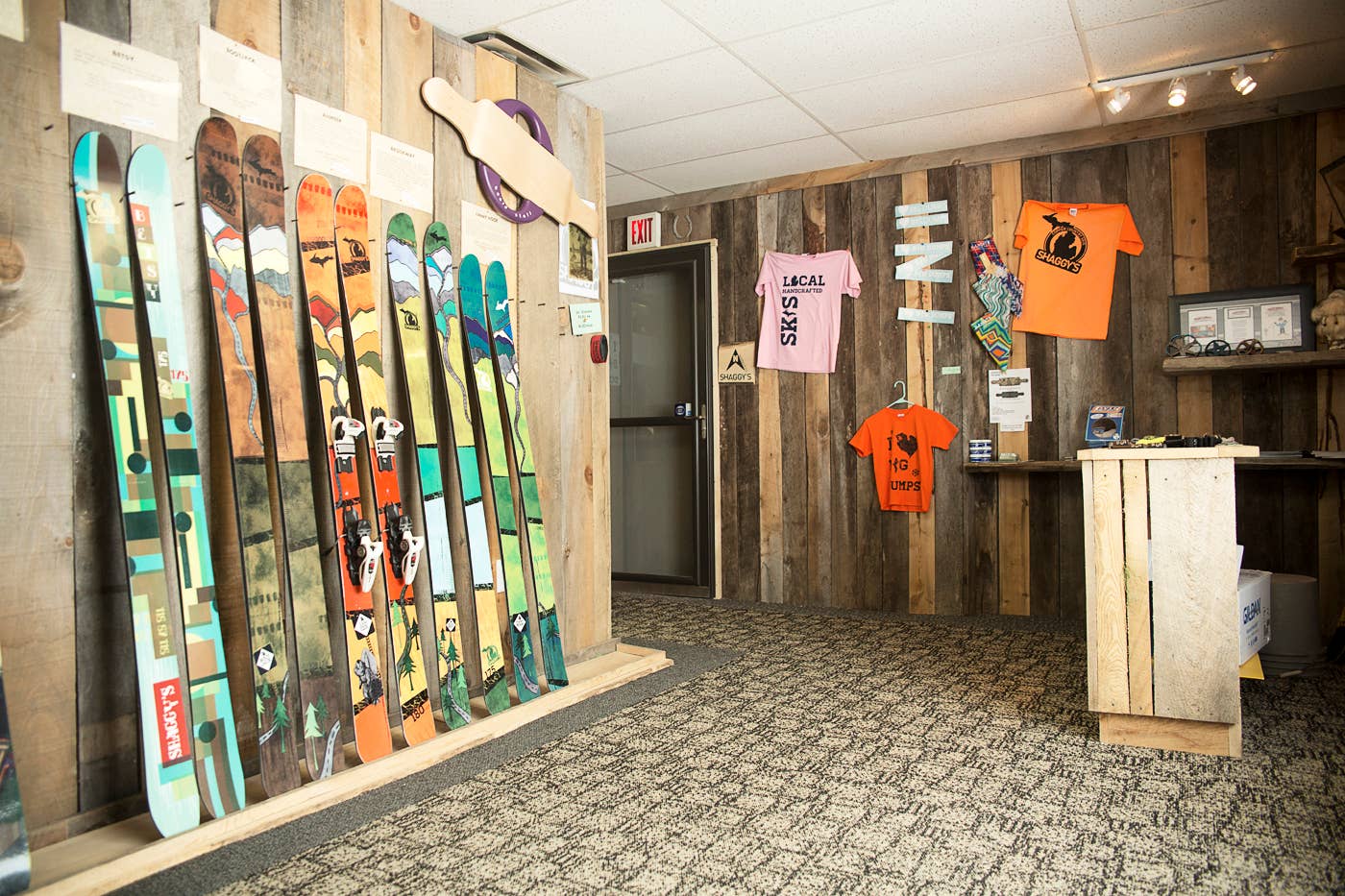 Your one-stop shop for Michigan-made skis and an “I love big dumps” t-shirt, emblazoned, of course, with the Lower Peninsula of Michigan in place of a heart. Photo by Matt Keiser (