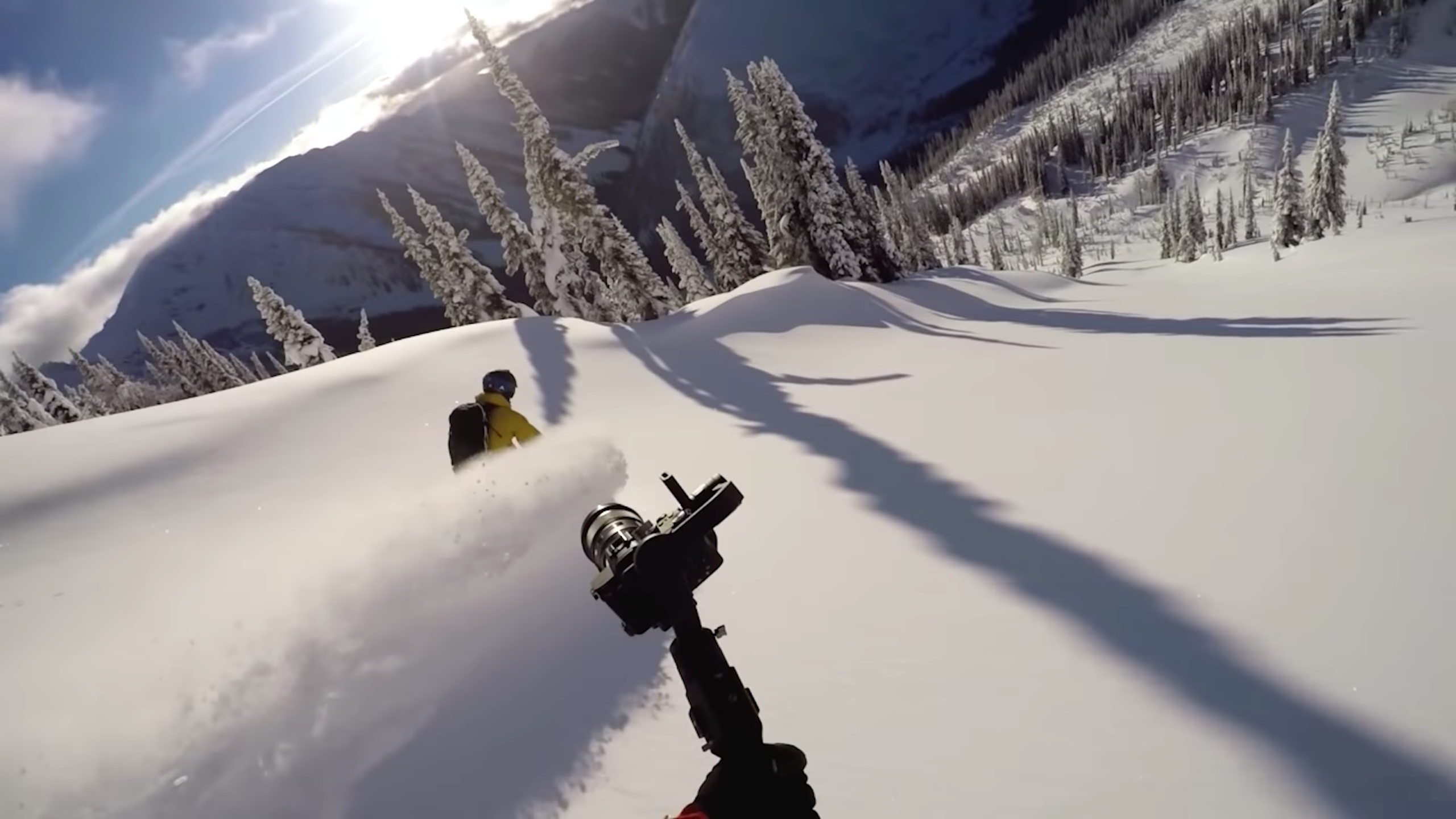 Getting follow cam shots is simple, right? You just follow your buddy while pointing a GoPro in their general direction. That may be true, but getting good follow cam shots isn't quite as simple, especially when you add cliffs, trees, and other features into the equation. In many cases, the cameraperson has to ski the same line as the athletes—all while wrangling a camera. Timing and positioning is critical, and requires a fair bit of planning to get right.