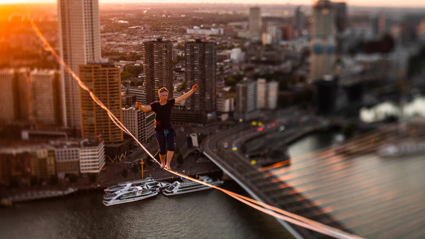 There’s slacklining in your backyard, and then there’s walking a piece of half-mile-long piece of webbing strung between two high-rise buildings across a river. Estonian slackliner Jaan Roose prefers the latter. In his latest stunt across the New Meuse river in Rotterdam, The Netherlands, he walked one of the longest and steepest urban highlines ever – the anchors had a 130-foot height difference.