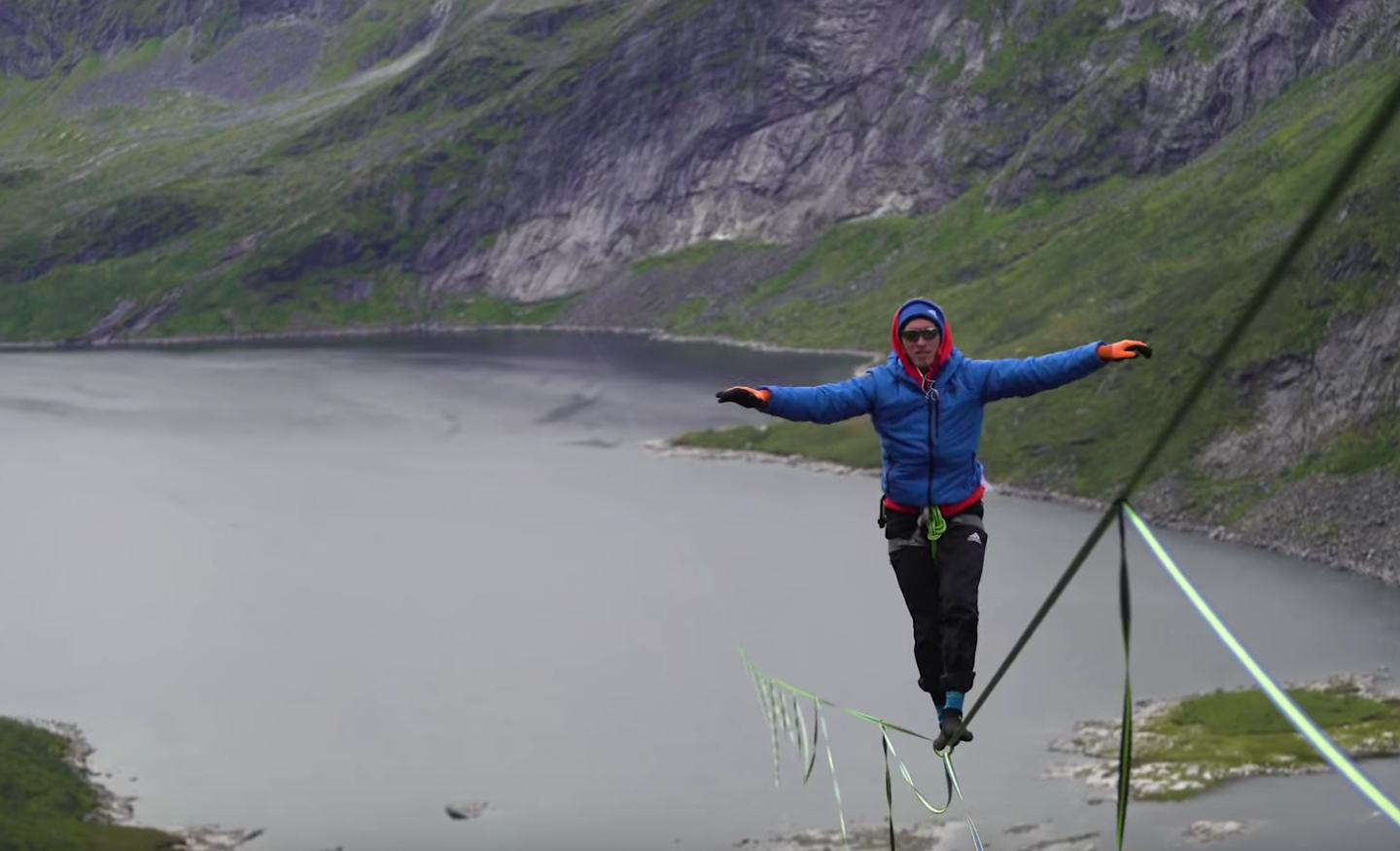 While certainly still one of the fringe-iest sports out there, highlining (walking a slackline hundreds of feet off the ground) has certainly caught on in recent years. Every few months, we hear of a new distance record being set, but this one blows the rest out of the water. Rigging between two separate Norwegian mountains, pro highliners Quirin Herterich, Friedi Kühne, Samuel Volery and Lukas Irmler walked a 2,800-meter-long line. That’s almost 2 miles of walking on a thread through the sky.