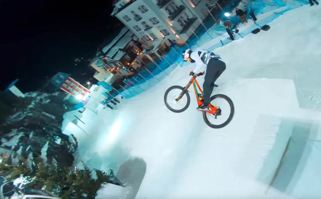 Austrian mountain biker Fabio Wibmer has a penchant for riding his bike places it doesn’t belong. We saw him put rubber on snow last year – dropping into a ski resort from a helicopter on his DH bike – setting a long-jump record on a bike on his way down. This year, he showed up at Red Bull Playstreets, that weird Austrian contest where they turn a tiny mountain town into a wildly creative slopestyle course for skiers and snowboarders.