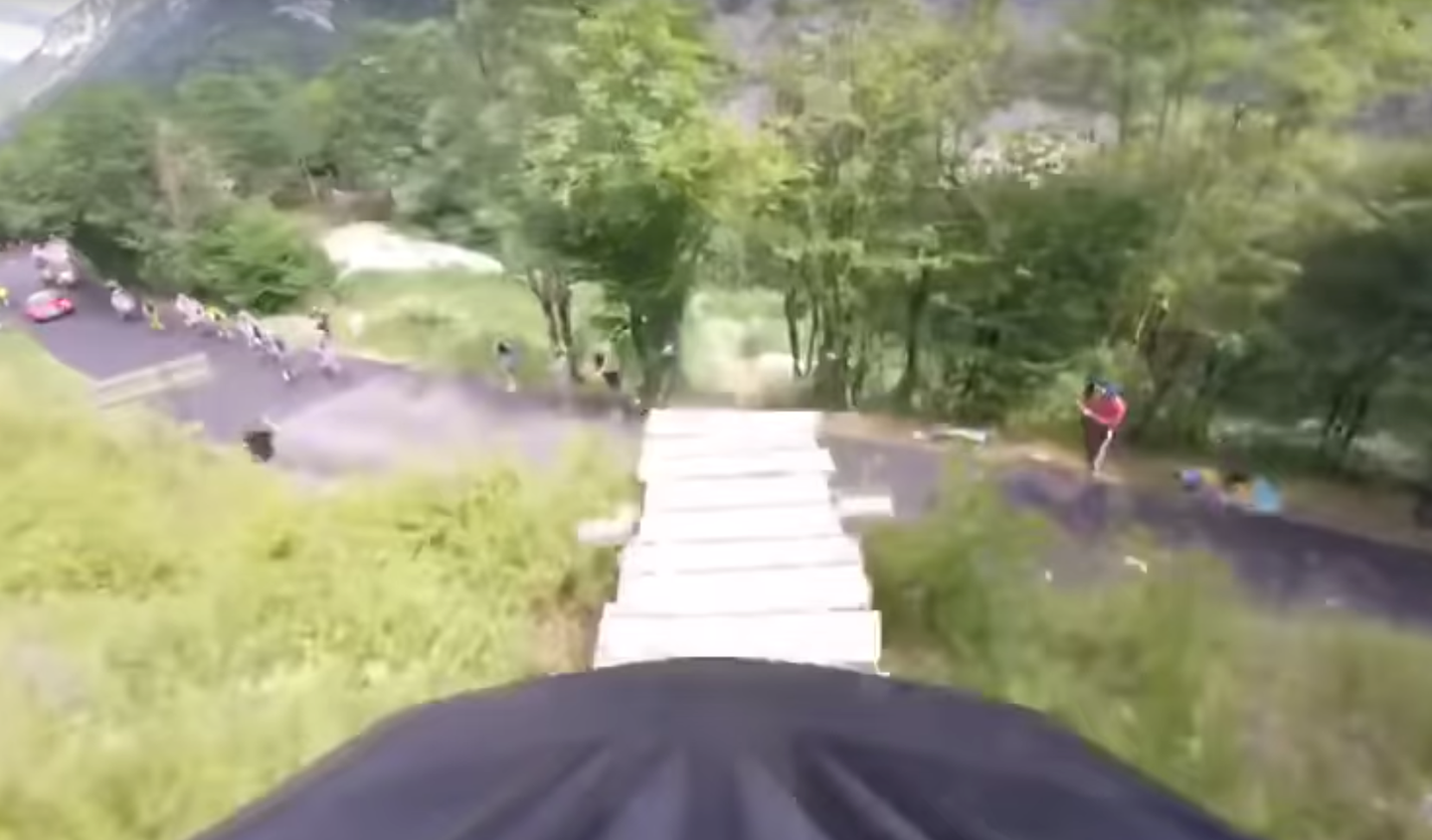 Well, the Tour de France finally got interesting this year. While it’s certainly not the first time someone’s done this, Alexis Bosson certainly styled his jump this year. Not only did he clear the pack and make it on international TV, he threw a big ol’ suicide no-hander over the road gap.