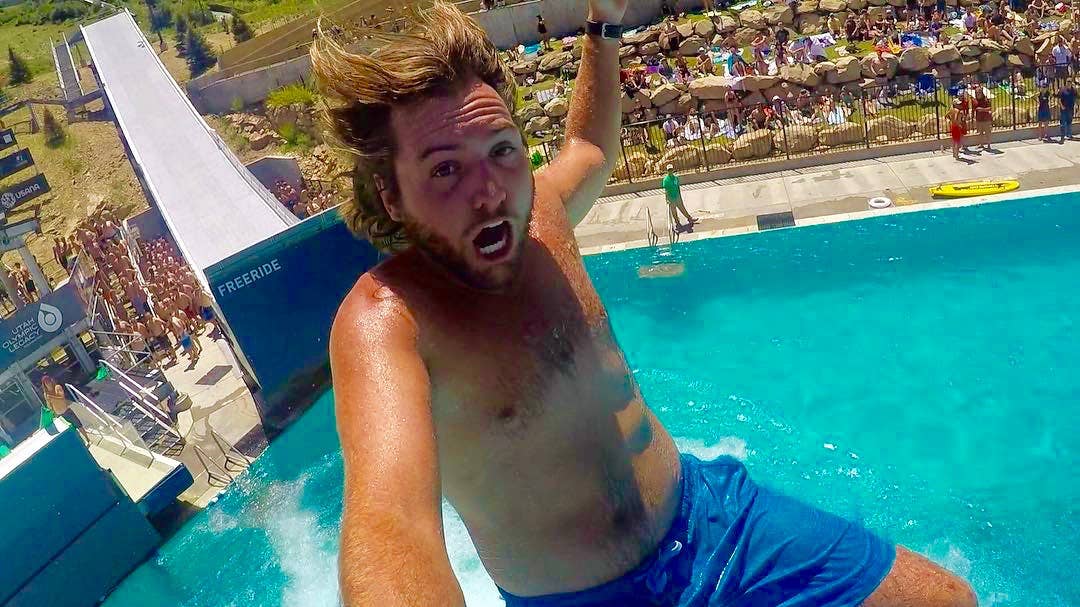 Freestyle skiers and snowboarders typically use the pool to train, but it opens up to the public twice per summer to host the world’s steepest slip ’n slide party.