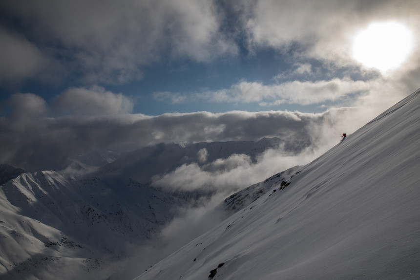 The sun is low in the sky and clouds undulate by, making for warm, soft, light mixed with dark shadows. A gyrfalcon surfs the thermals above them and the mountain they are standing on drops dramatically down to the river valleys that run north to the Beaufort Sea. DesLauriers, Nelson, and Figenshau revel in a silence that doesn't exist anywhere else on a summit in the middle of the wildest place in America.